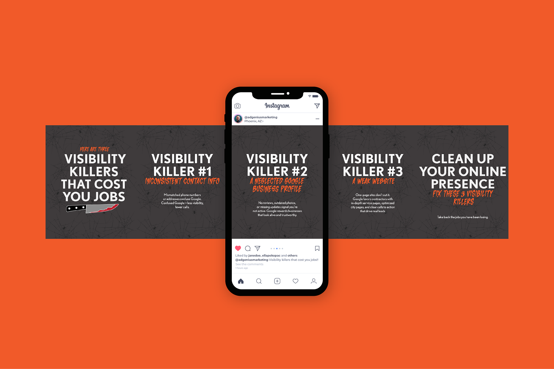 For my internship at Ad Genius Marketing in Phoenix, Arizona, I was tasked with developing a series of Instagram advertisements for the agency. I was provided with the core messaging and campaign goals, but given full creative freedom in shaping the visual direction, tone, and execution. This project allowed me to craft engaging, platform-specific content that aligned with the brand’s voice while exploring my own design style. Through this work, I gained hands-on experience in digital advertising, social media strategy, and creating polished, conversion-focused creative assets for a real client environment.