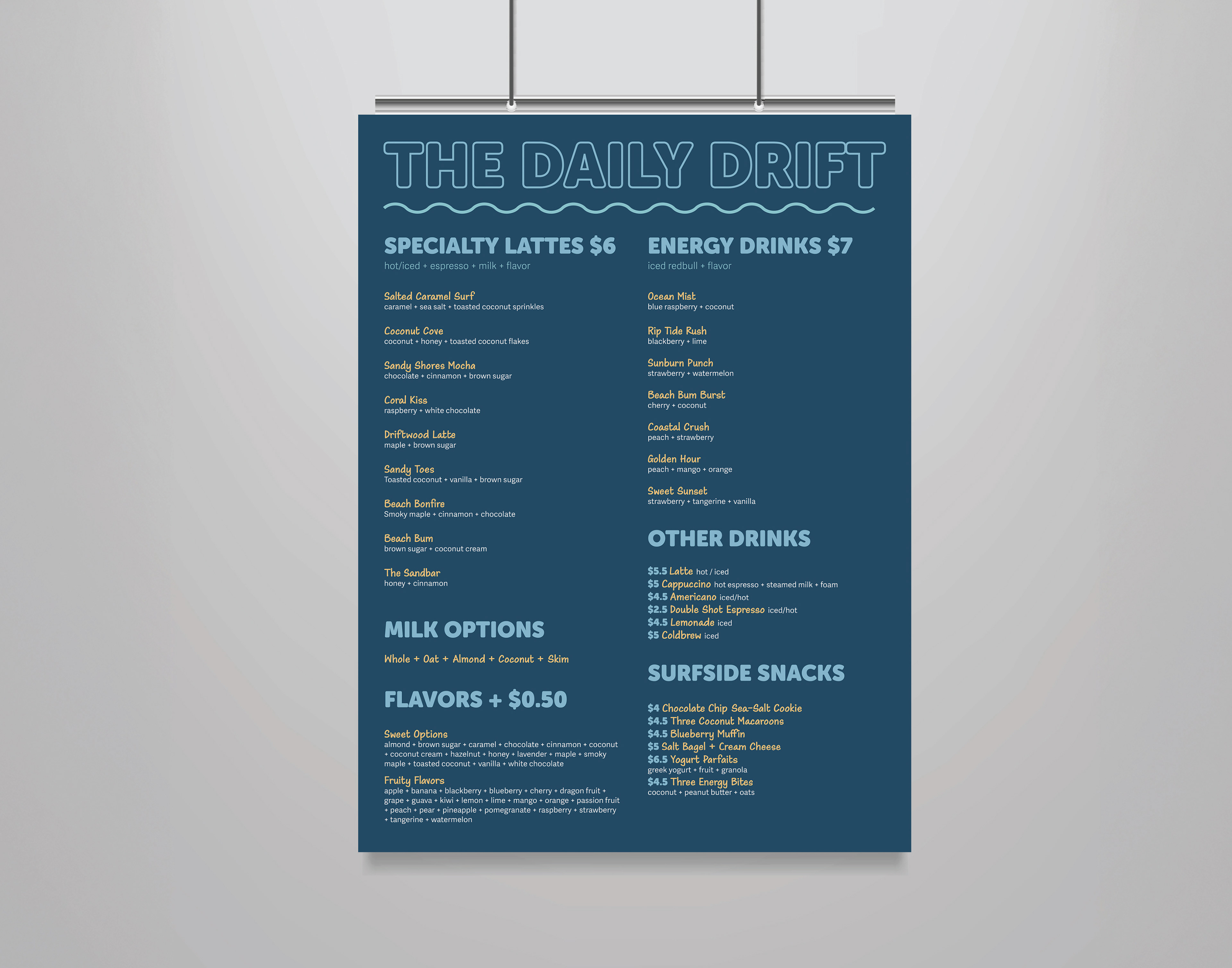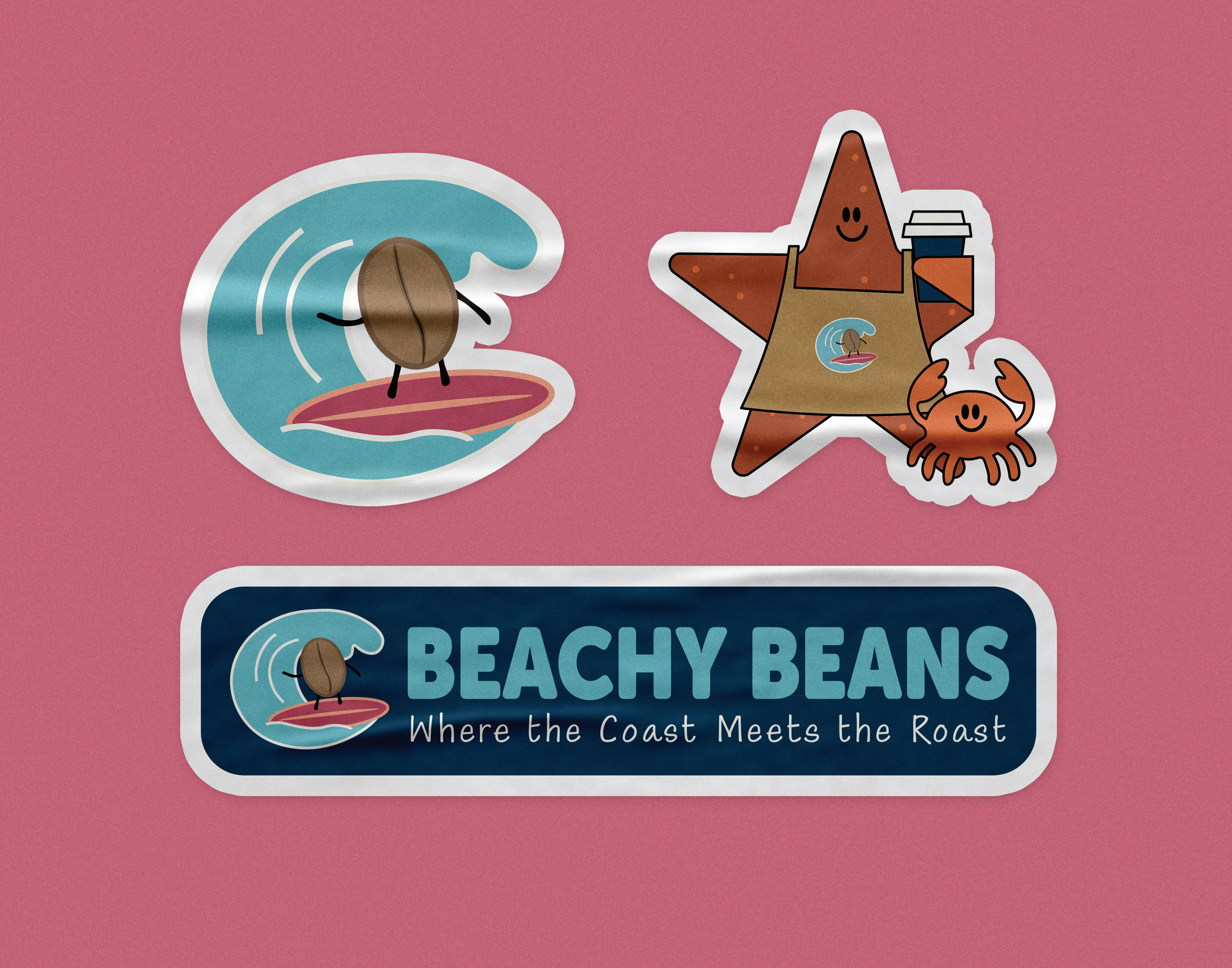 This project explores the development of a cohesive visual identity for a beach-inspired coffee brand. The work includes branding elements such as packaging, sticker designs, menu concepts, and supporting graphics that create a warm, playful, and coastal atmosphere. The goal of the project is to establish a clear aesthetic direction and showcase how visual design can shape a memorable and inviting brand experience.