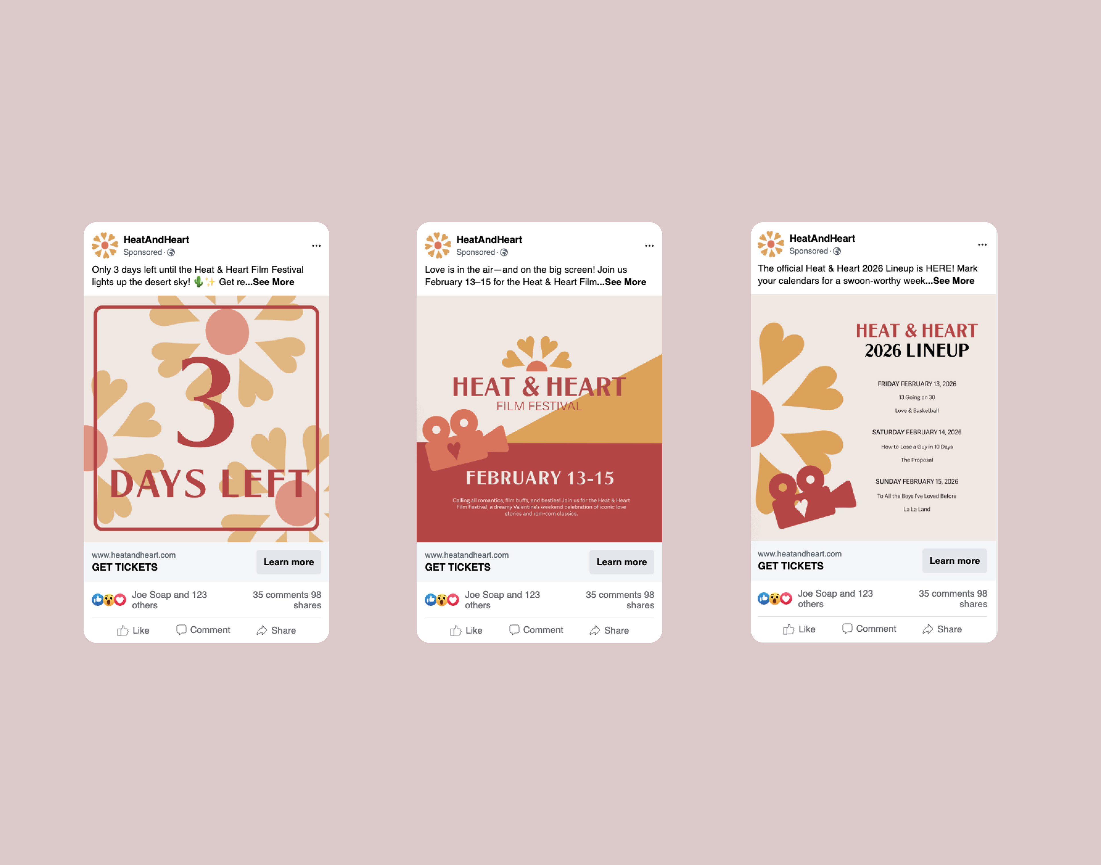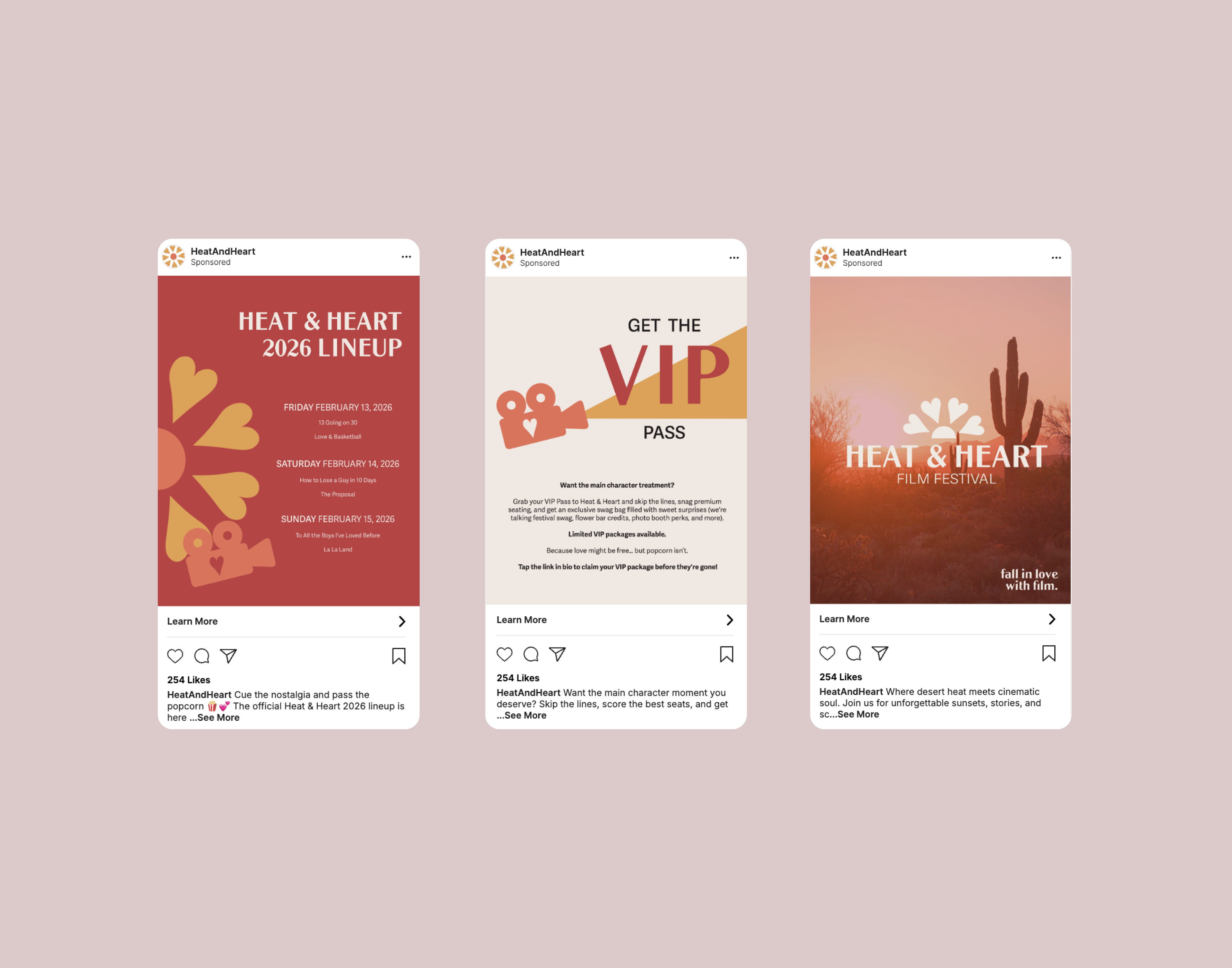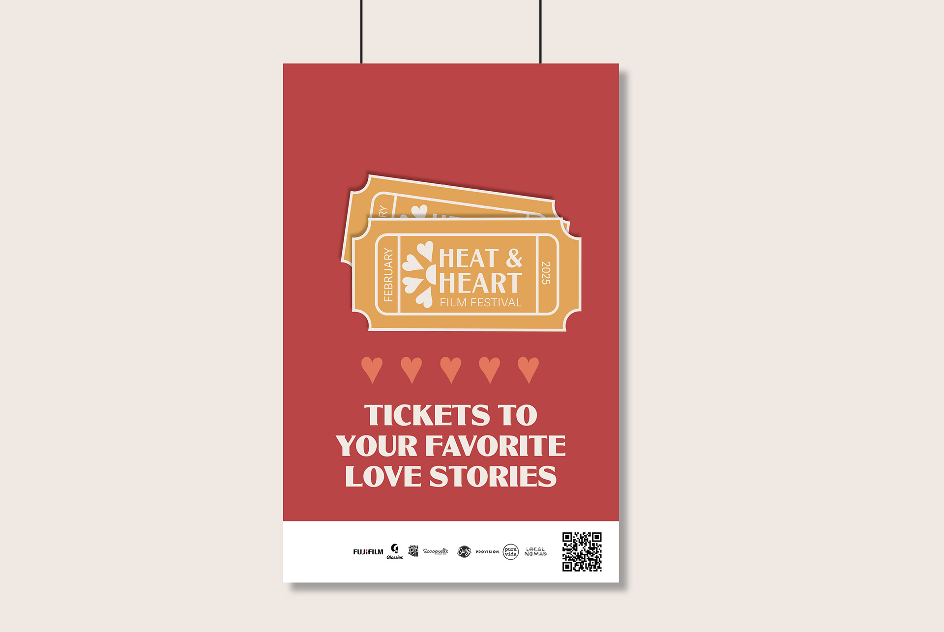 Heat & Heart is a Valentine’s Day–themed outdoor film festival concept set in Phoenix, Arizona, celebrating nostalgic 2000s rom-coms and romantic classics. The visual identity blends soft desert-inspired pastels with playful, love-centric motifs to create a warm, inviting atmosphere. The project includes a full brand system and event collateral such as posters, merchandise, social graphics, and on-site signage, all designed to reflect the festival’s dreamy, cinematic personality. Through cohesive typography, illustration, and photography, the branding captures the magic of shared movie nights, creating an experience that feels both romantic and modern.