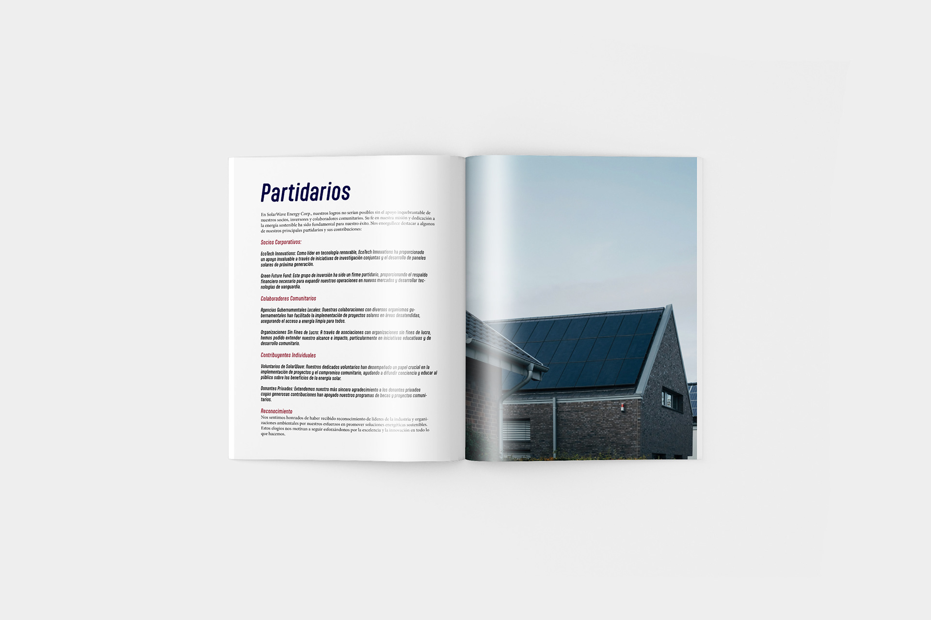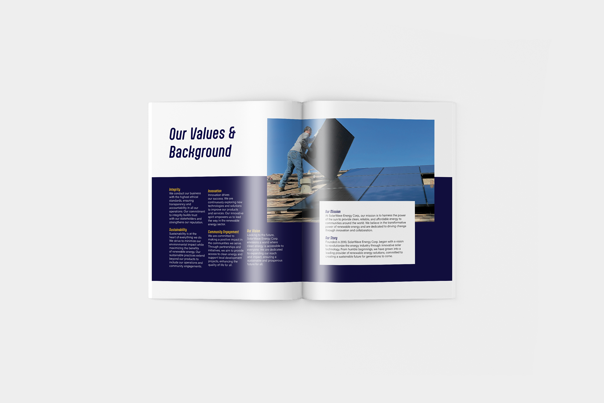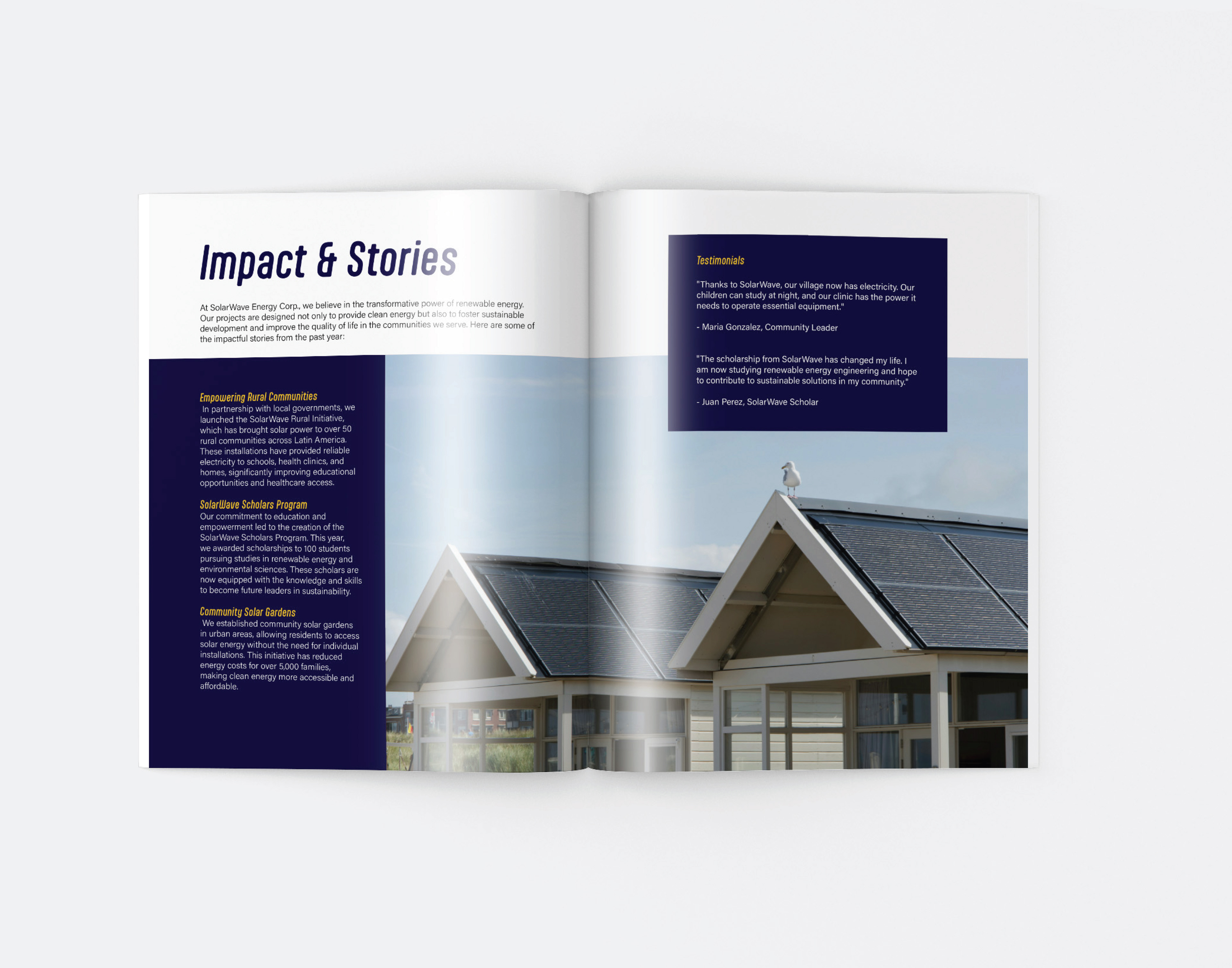 This bilingual annual report was designed for SolarWave Energy Corp., a renewable energy company focused on accessible, affordable, and community-driven solar solutions. The report reflects the brand’s mission to reduce reliance on fossil fuels, promote environmental responsibility, and empower diverse audiences through education and outreach. The visual and written content highlights SolarWave’s commitment to sustainability, innovation, and corporate social responsibility, presenting the company as a leader in building a cleaner, more resilient future.